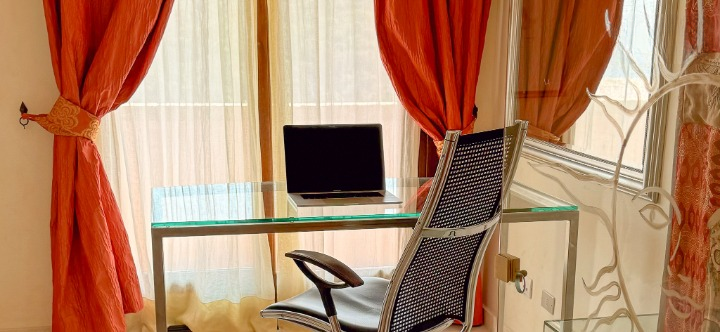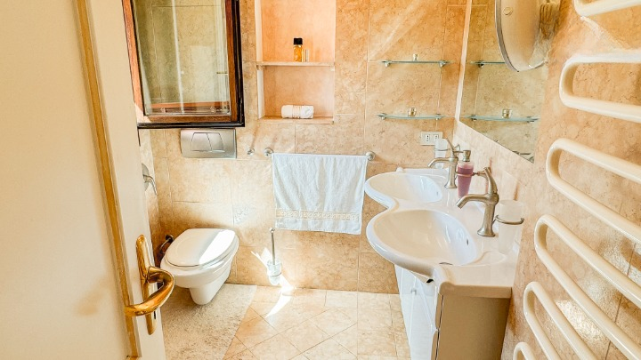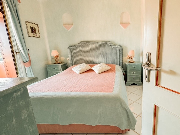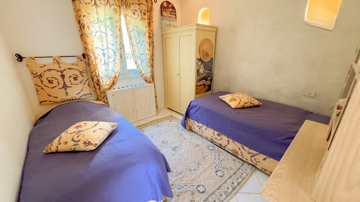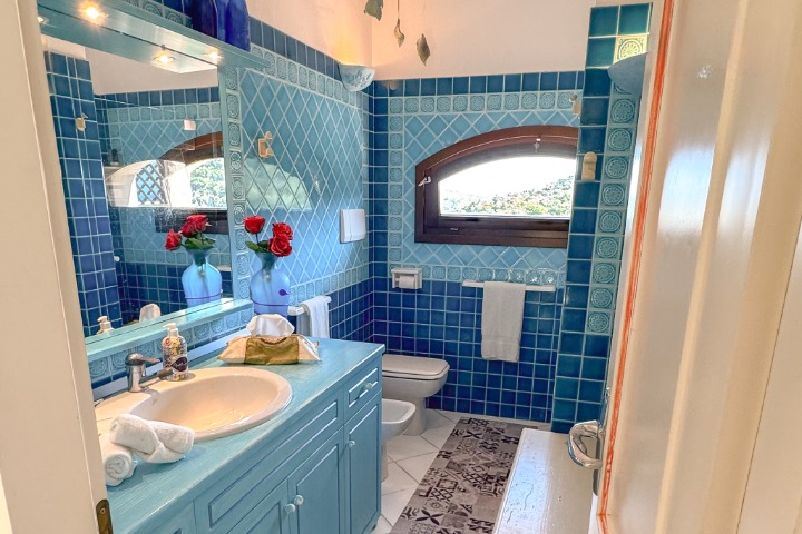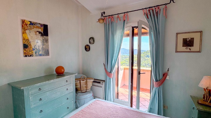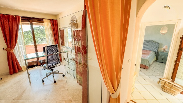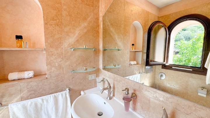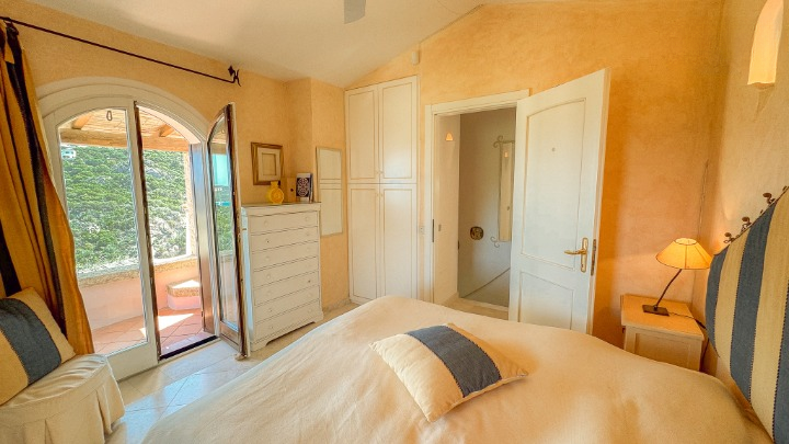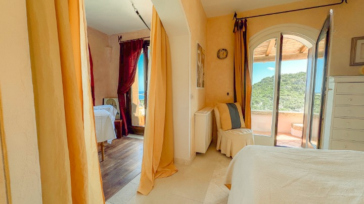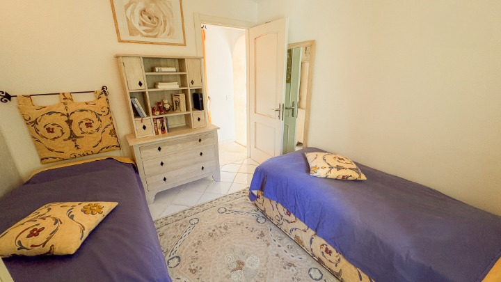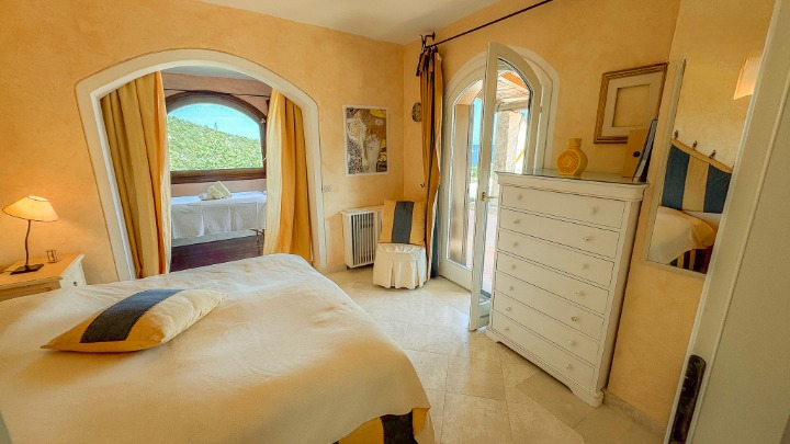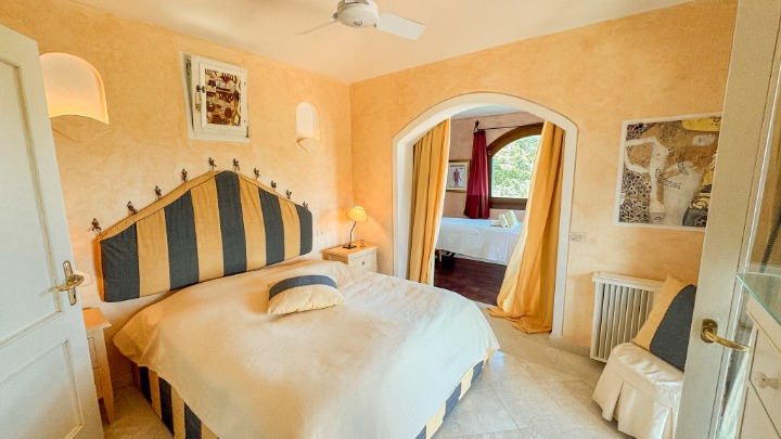La zona notte, situata su un livello rialzato, ospita quattro camere da letto e bagni, inclusa una camera singola pensata per lo staff. Due delle camere/suite affacciate direttamente sul mare e una terza stanza attualmente adibita a studio – dispongono di terrazza privata. Le altre camere godono di una piacevole vista sul verde del giardino e sono tutte dotate di armadi a muro e bagni ben rifiniti.