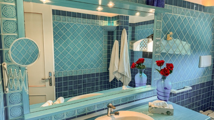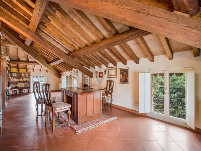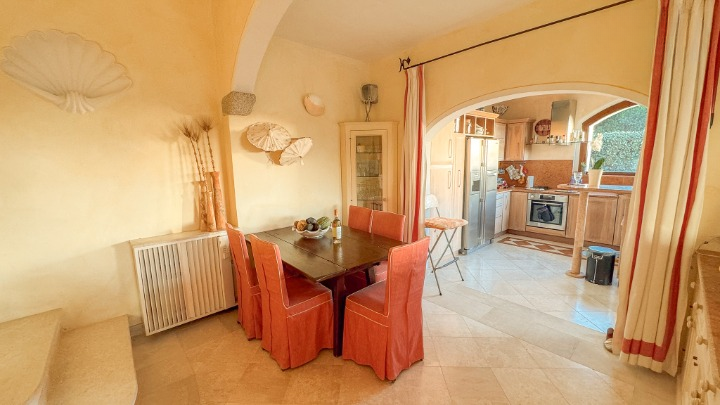 L’ingresso principale conduce all’ampio living, composto da una zona salotto con raffinati divani, zona pranzo e cucina abitabile in stile mediterraneo, rifinita con materiali di pregio come legno e marmo, e dotata anche di un angolo bar. Completano questo piano un bagno per gli ospiti e una comoda lavanderia separata.