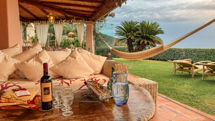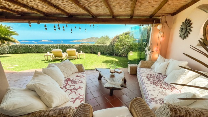 L’accesso privato conduce al giardino, dal quale si apre immediatamente una spettacolare vista sul mare a 180 gradi e sulla meravigliosa veranda con camino, sicuramente uno degli angoli più belli e suggestivi della villa. La veranda è una naturale estensione del living e, chiudendo le preziose vetrate scorrevoli, diventa il giardino d’inverno riscaldato.
