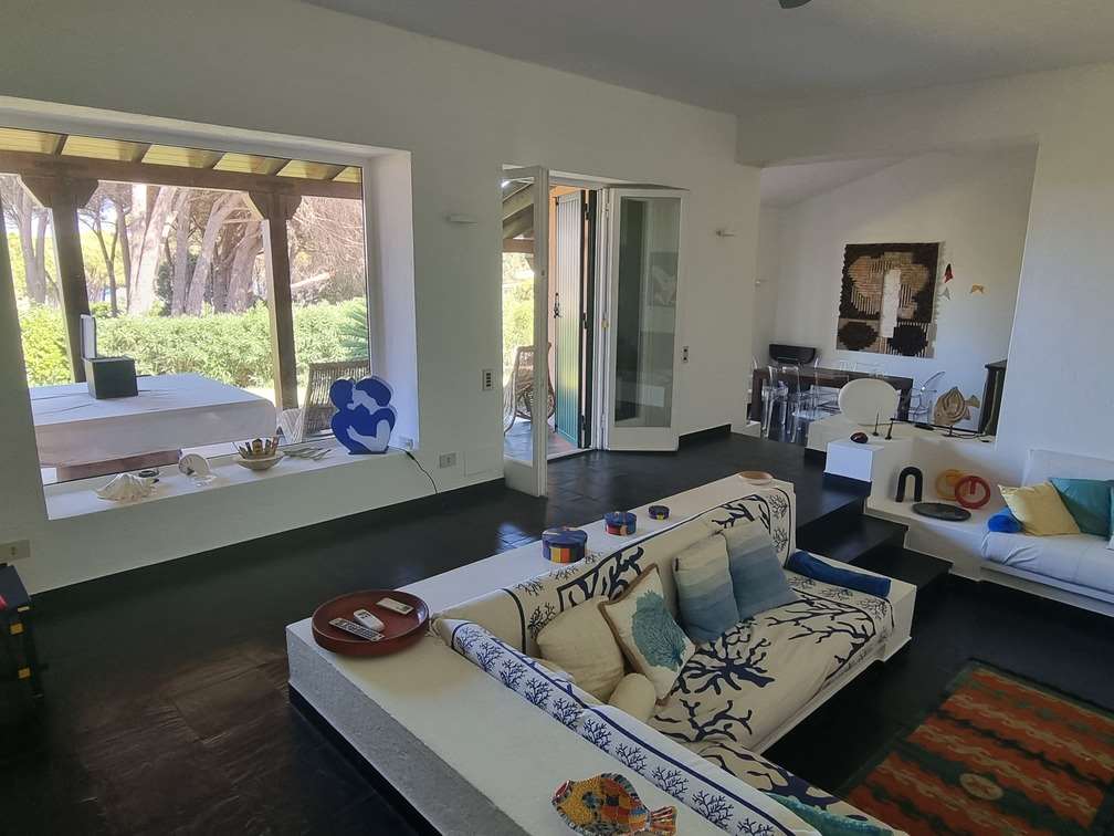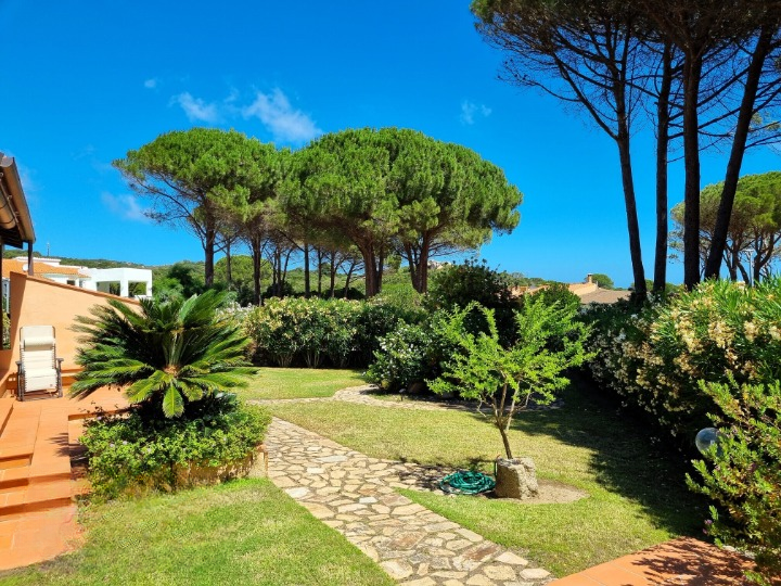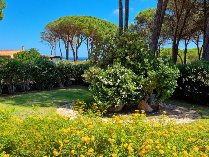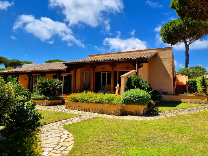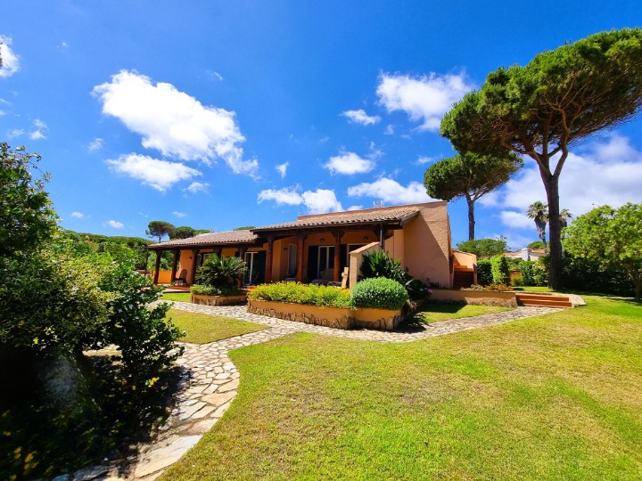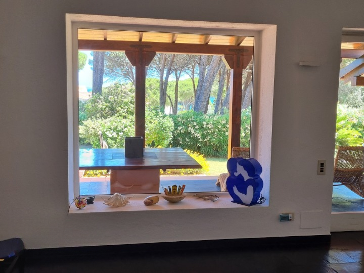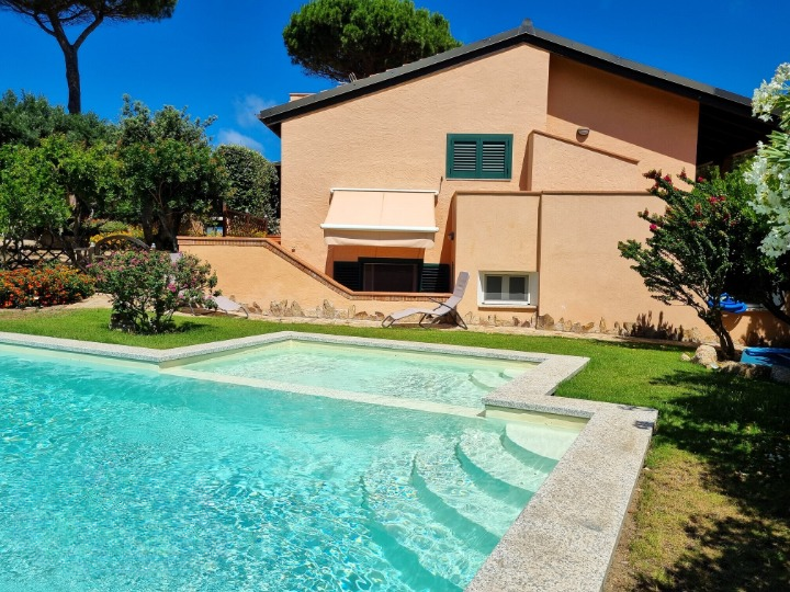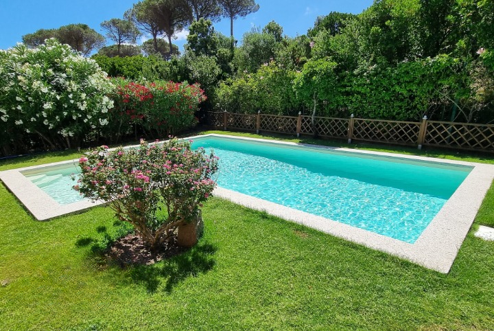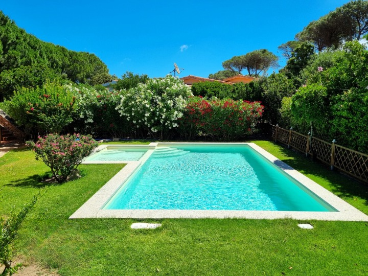 Nel cuore del giardino si trova una splendida piscina privata, realizzata nel 2019, posizionata in modo da garantire privacy e relax. La villa, situata a soli 200 metri dal mare, si sviluppa interamente al piano terra e accoglie gli ospiti con ambienti eleganti e ben distribuiti: un ampio soggiorno arricchito da una particolare vasca lounge, una sala da pranzo luminosa, tre camere da letto, tre bagni e un angolo cottura progettato per collegarsi agevolmente sia con la zona living che con l’area barbecue esterna, ideale per pranzi e cene all’aperto.