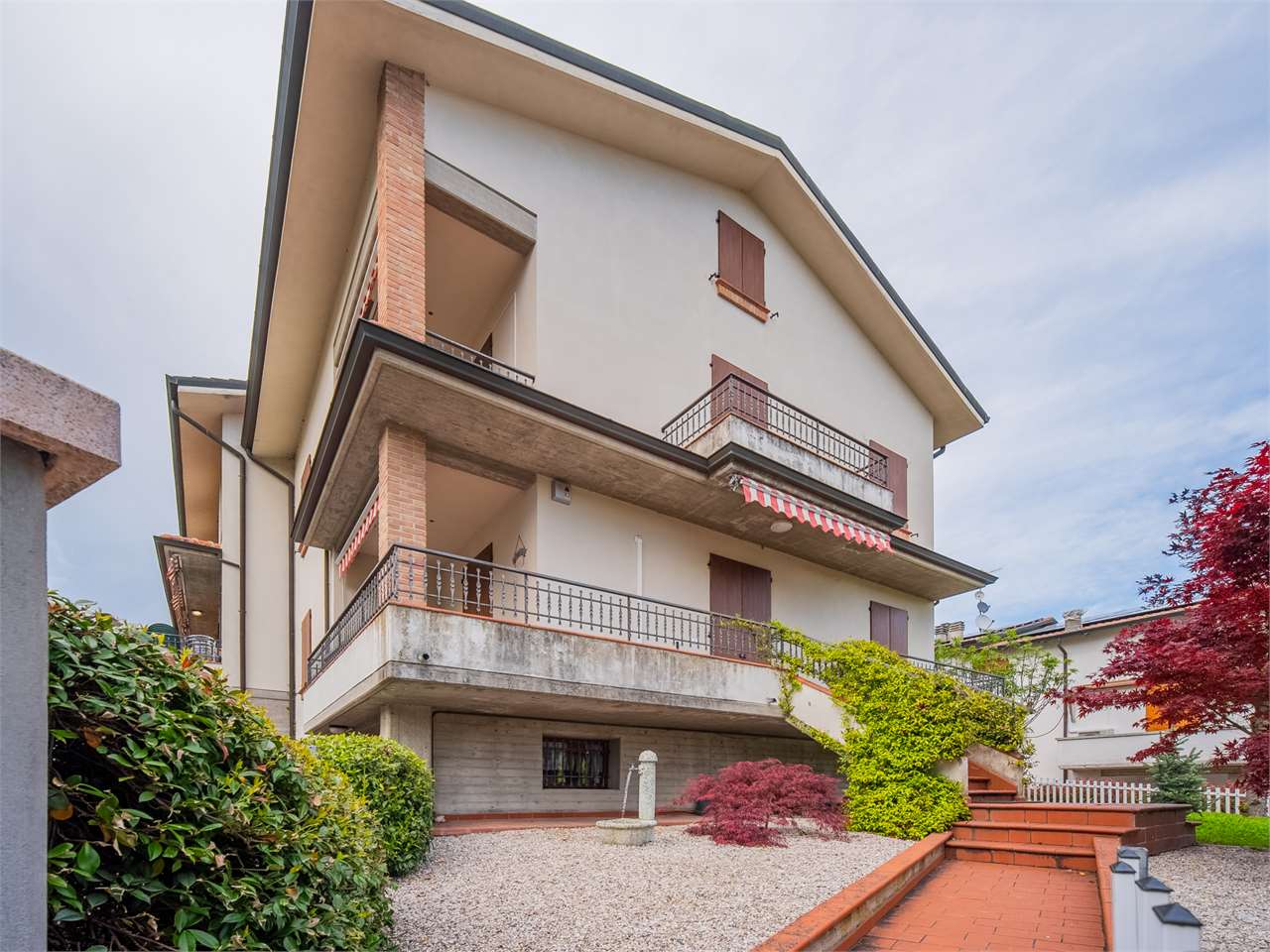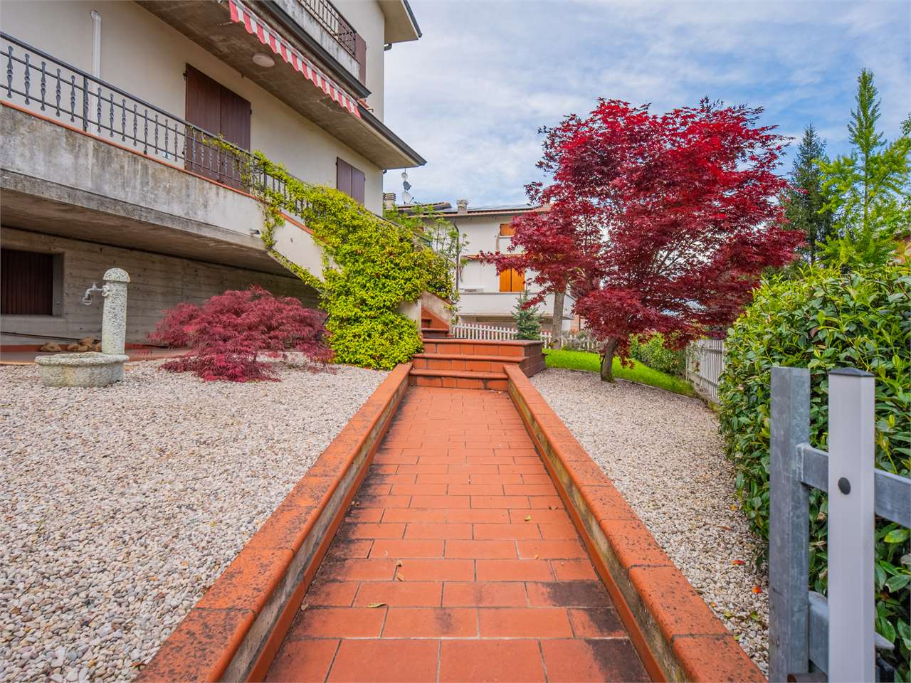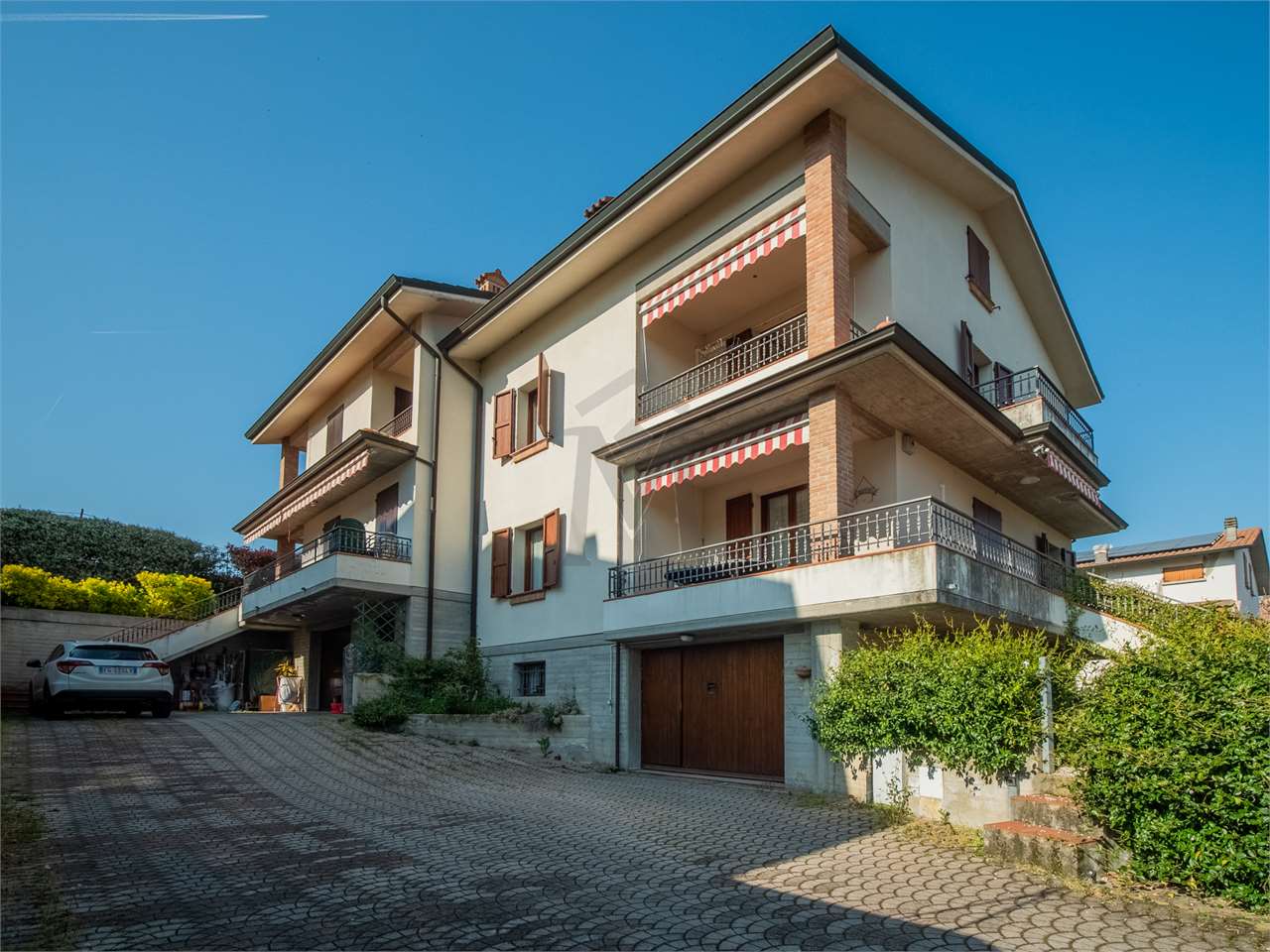 In zona residenziale comoda ai servizi ed in strada chiusa, proponiamo elegante villa abbinata di fine anni ’80 di circa 221 mq. dalle ottime metrature così composta: ingresso al piano rialzato con bellissimo loggiato che collega tutta la zona giorno, disimpegno con camera matrimoniale, balcone e bagno; stanza pluriuso con scala a chiocciola che si collega al piano interrato. Al primo piano, il tutto collegato da maestosa scala in legno, zona open-space pluriuso con balcone, cucinotto, disimpegno notte con camera matrimoniale, balcone e bagno. Al piano interrato, lavanderia, locale caldaia, cantina, due ripostigli ed ampio garage di 32 mq con ingresso da cancello automatico comune con il vicino. Completa la proprietà giardino privato con irrigazione automatica di 166 mq. Proprietà spaziosa, versatile; completa di aria condizionata con pompa di calore, allarme, tende da sole, camino.
