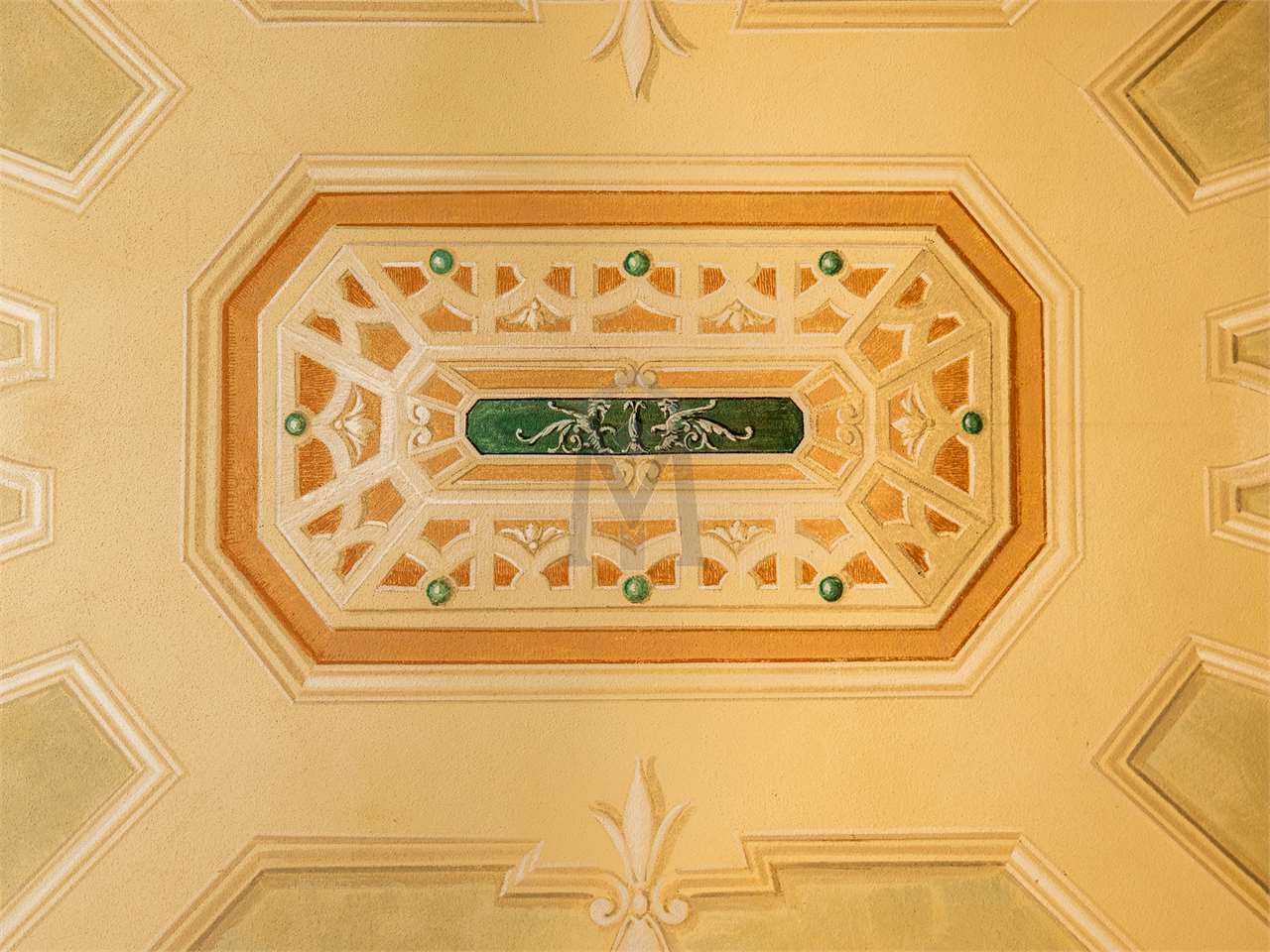 Al piano rialzato si accede, direttamente dal giardino, all’ingresso principale costituito da una sala ottagonale dalla quale si trova lo studio e la parte destinata a salotto e pranzo di rappresentanza.