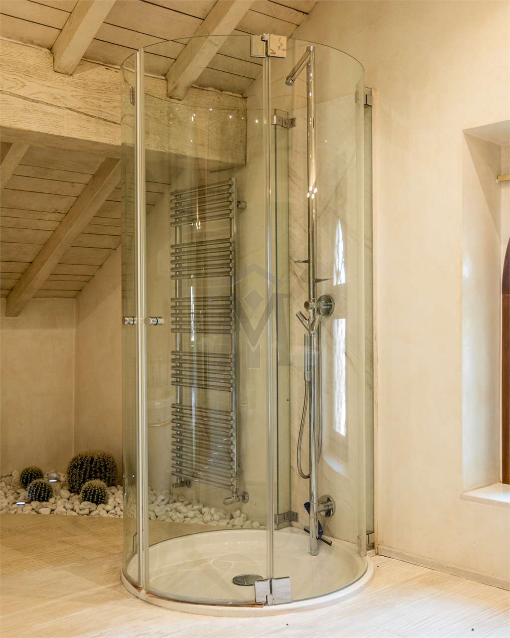 La villa padronale si sviluppa su quattro livelli e nello specifico a piano terra, nella zona più domestica, si trovano la cucina, il salotto e un bagno. La cucina e il soggiorno danno direttamente sulla zona esterna.