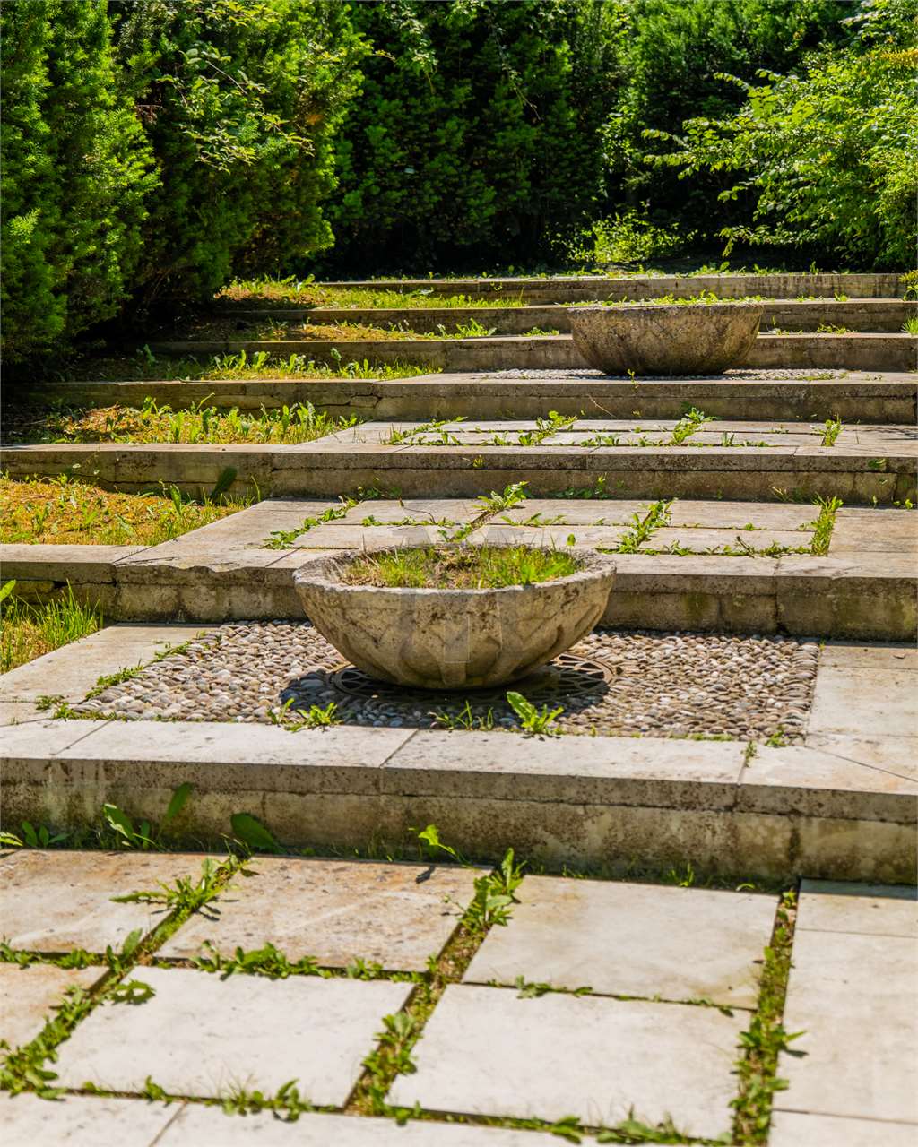 Dal “parterre” prende origine il “percorso dell’acqua” dove gradinate di pietra e prato seguono il “filo” centrale di piccoli specchi d’acqua.