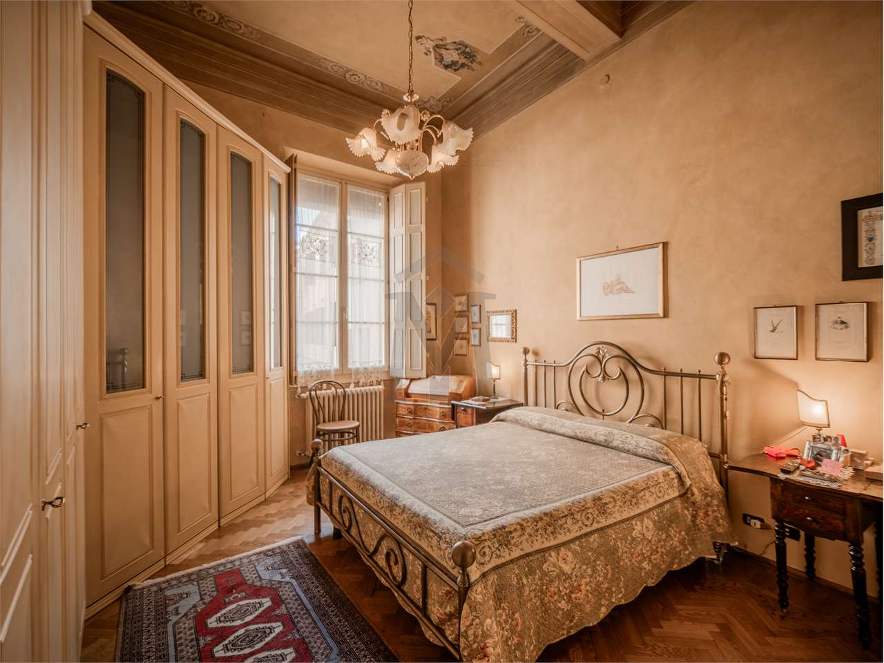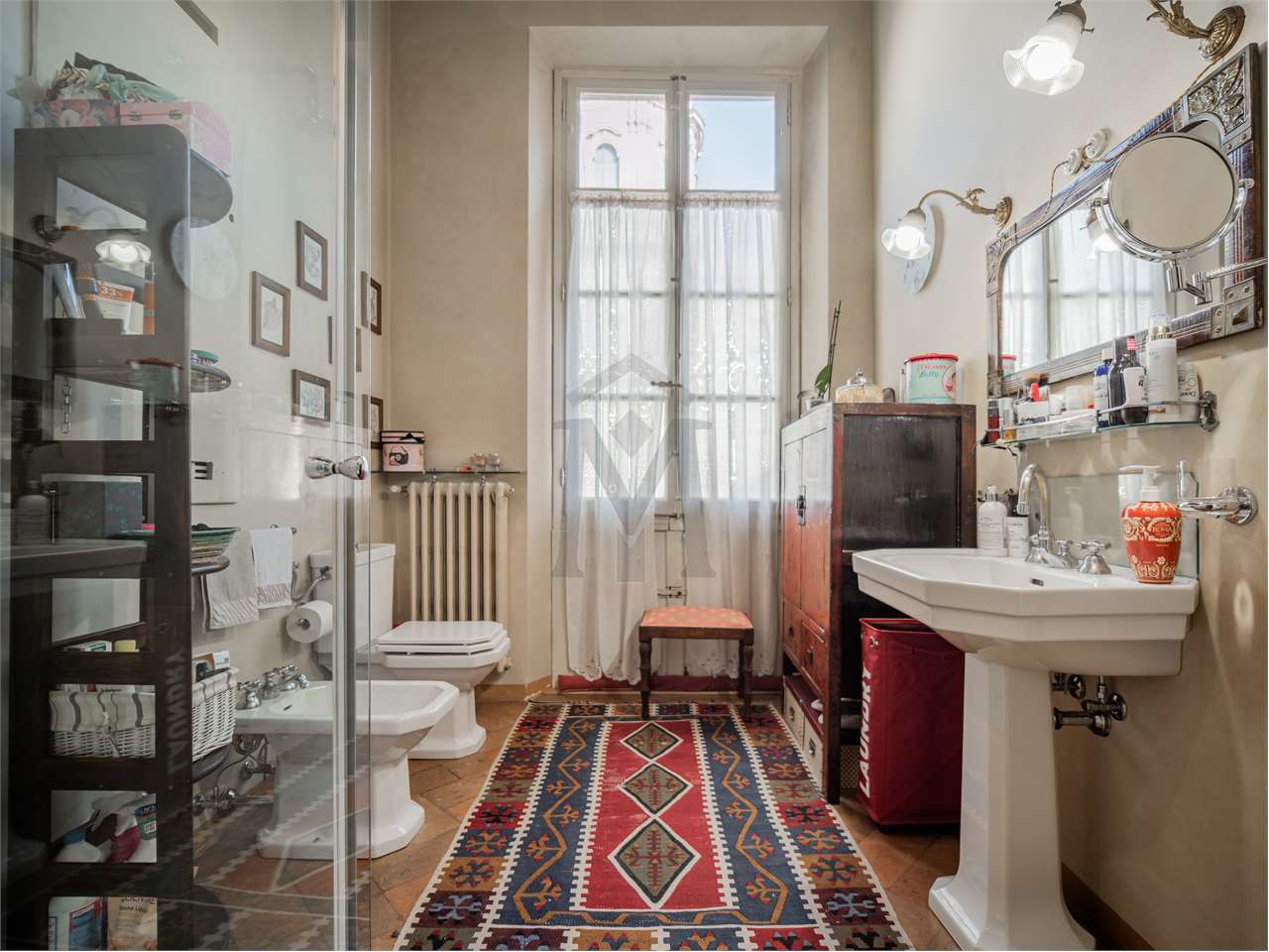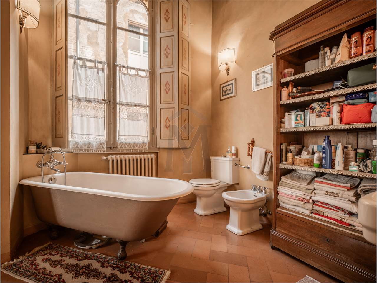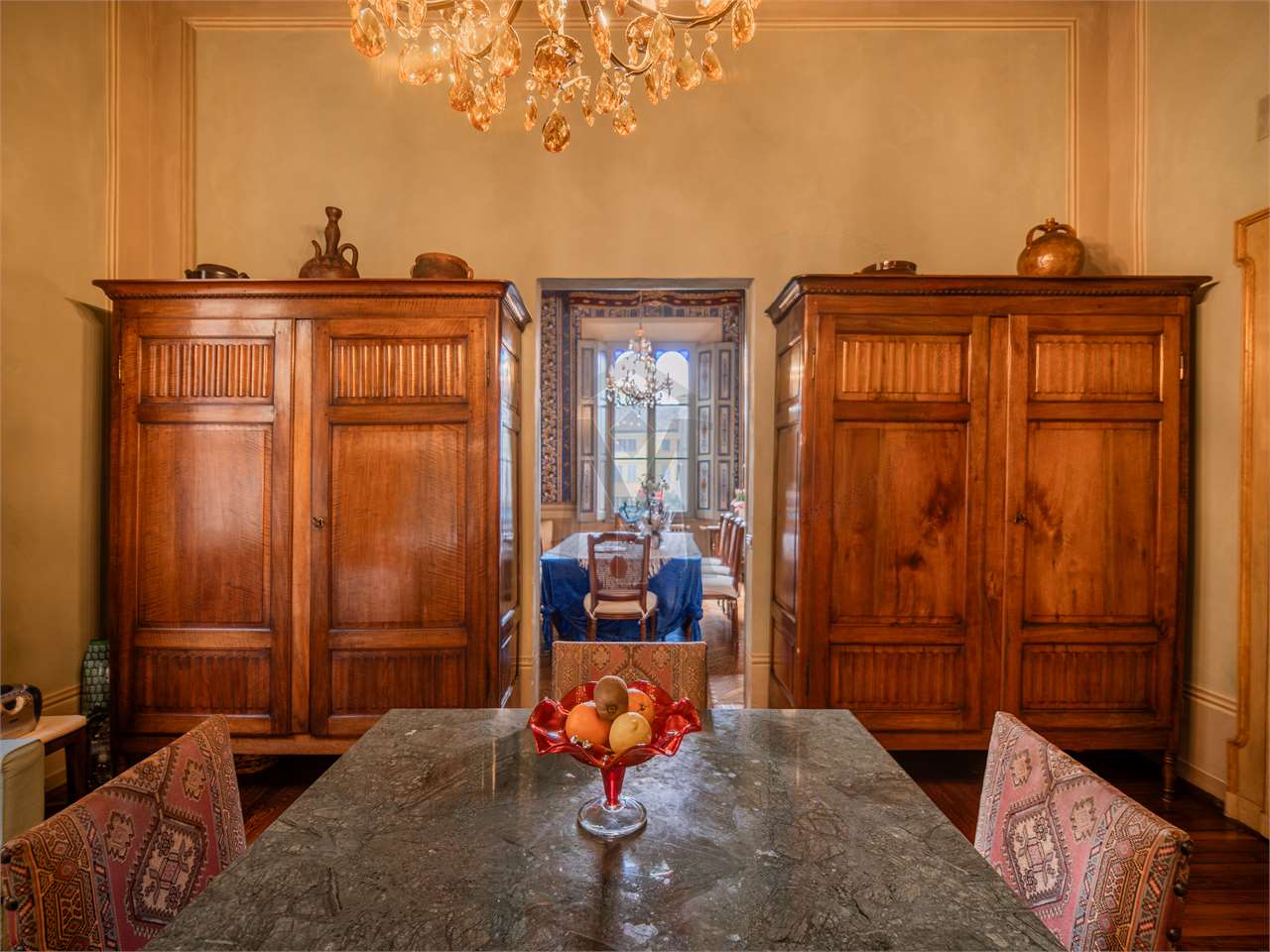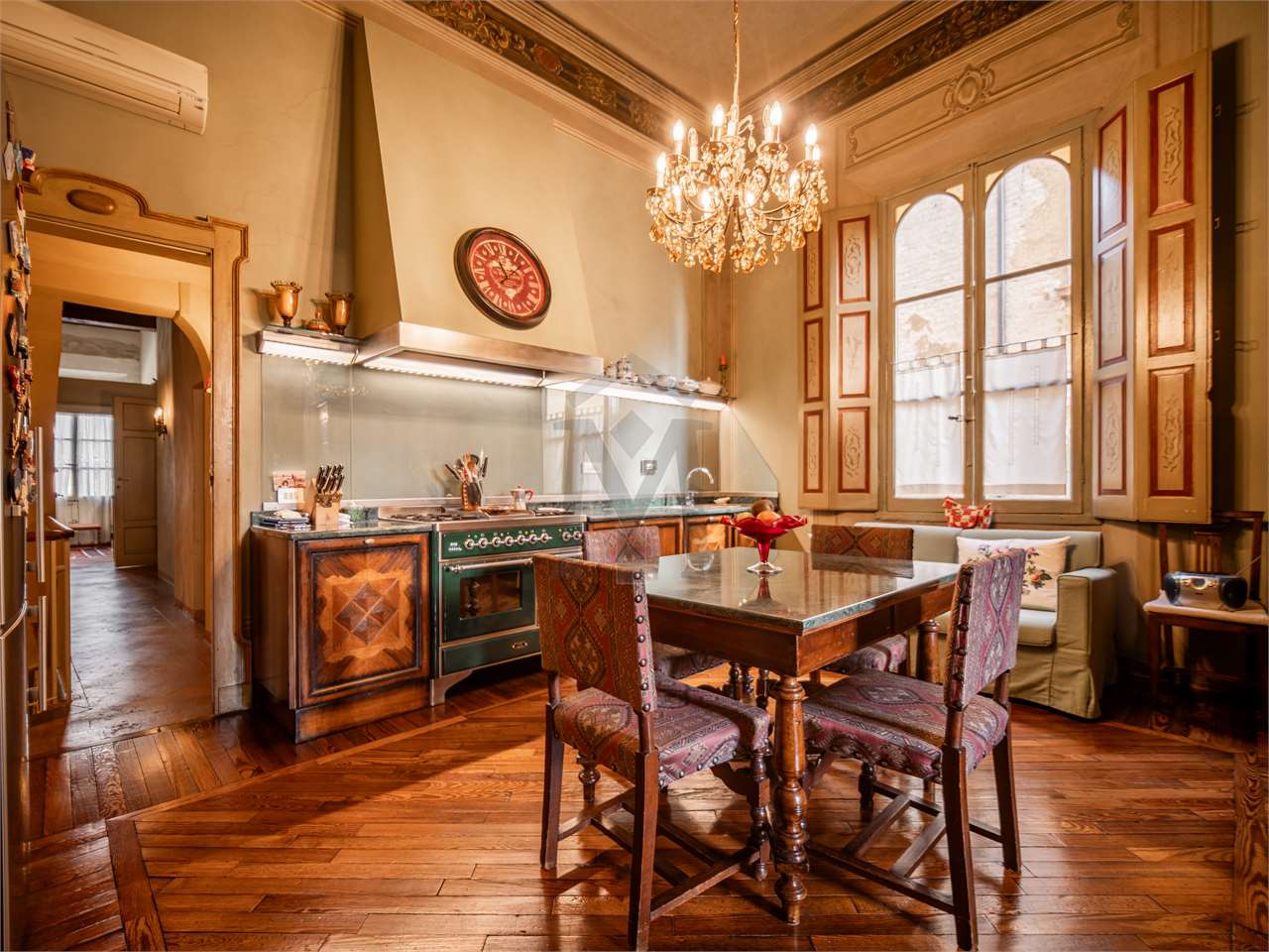 Dal disimpegno una scala interna collega gli ambienti accessori: al piano terzo si trovano lavanderia e locali di servizio; al piano terra un ulteriore ripostiglio con accesso secondario all’androne. Completano la proprietà ampie cantine con volti a botte al piano seminterrato . Gli ambienti abitativi, di notevole dimensione e altezza, nell’anno 2004 sono stati oggetto di un accurato restauro conservativo che ha valorizzato gli elementi decorativi originari: alti soffitti decorati e a cassettoni in legno, pareti finemente dipinte o rivestite con carte decorate a mano, porte d’epoca laccate, pavimenti storici in rovere e larice e prezioso cotto cinquecentesco recuperato. L’impiantistica è stata completamente rinnovata con riscaldamento autonomo a radiatori in ghisa e caldaia a condensazione, impianto elettrico moderno ed efficiente, nuovi servizi igienici e climatizzazione a zone.
