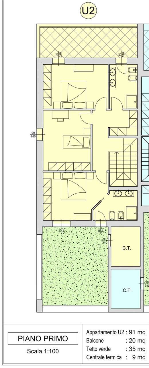Il piano primo ospita tre camere da letto, di cui una con bagno privato, un secondo bagno finestrato, una cabina armadio, un balcone ampio, un tetto verde di circa 35 mq e il locale tecnico.