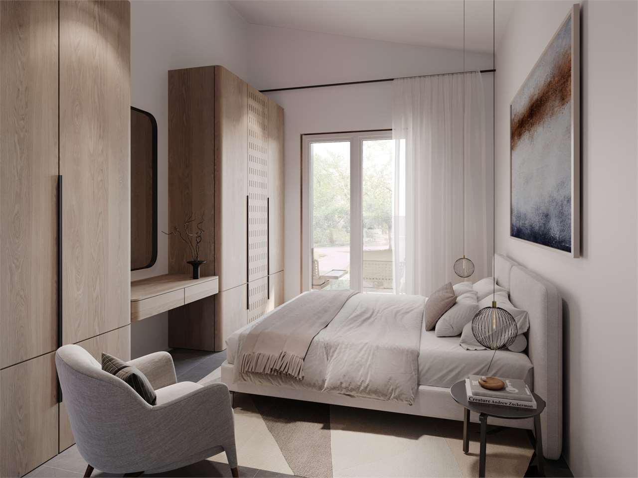 Le abitazioni si sviluppano su due livelli e offrono spazi ampi e luminosi: al piano terra la zona soggiorno con cucina open space, affacciata sul portico coperto e sul giardino privato, ideale per vivere l’esterno in totale privacy, completano il piano, il bagno, la lavanderia e il garage.